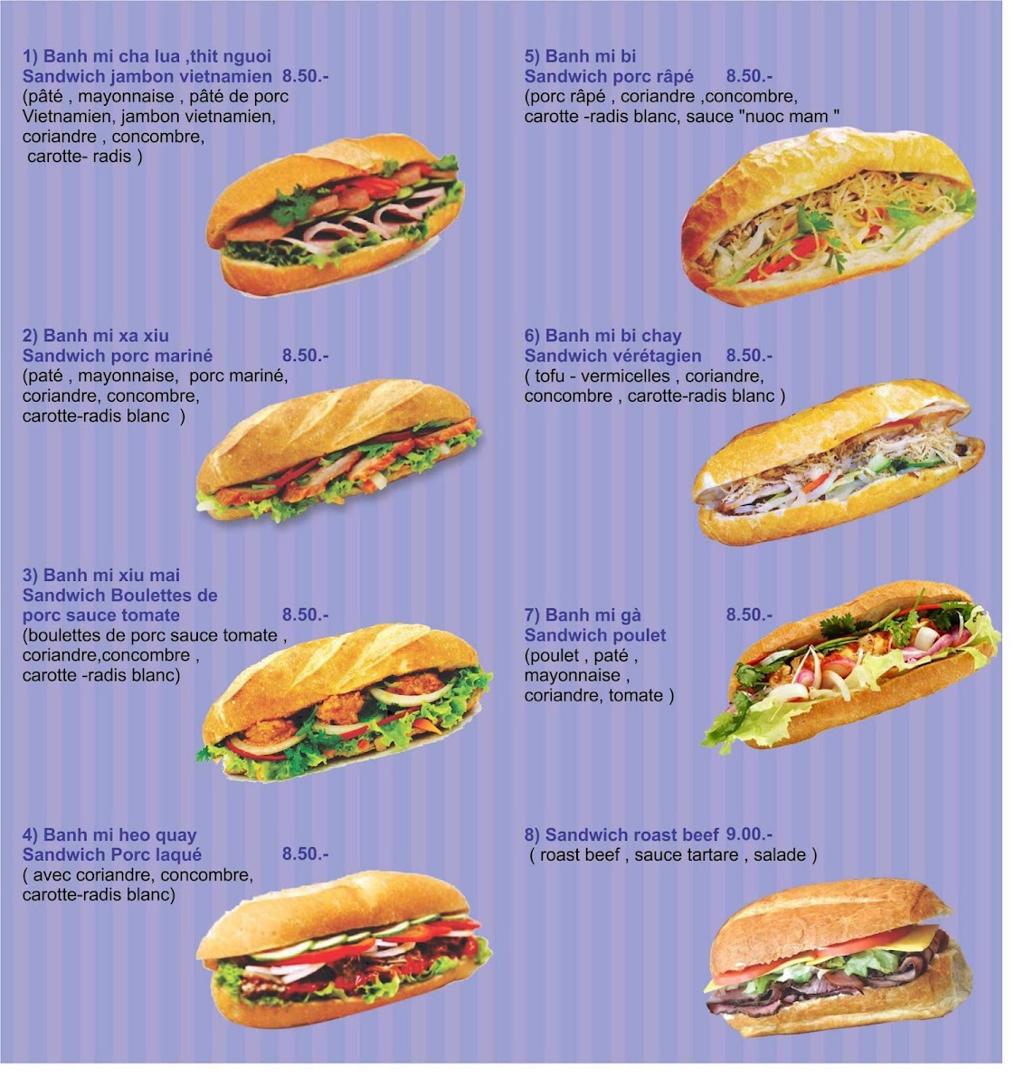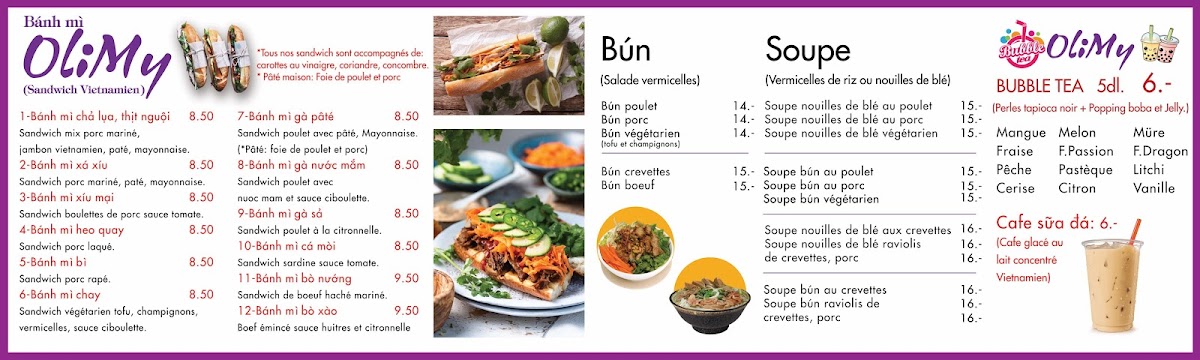 The menu at Sandwicherie Vietnamien Olimy reflects a focused and well-curated approach to Vietnamese street food, prioritizing clarity, balance, and everyday appeal. What stands out most is how the offering avoids unnecessary complexity and instead concentrates on a few signature items executed with consistency. Banh Mi No1 clearly anchors the menu, presenting the classic Vietnamese sandwich experience with a satisfying contrast of textures and flavors that feels both authentic and accessible, making it an obvious go-to choice for first-time visitors as well as regulars. Alongside the savory options, Bubble Tea plays an important complementary role, adding a refreshing and modern touch that broadens the menu’s appeal beyond just meals, making the restaurant suitable for quick snacks or casual meet-ups. The pairing of these standout items highlights a thoughtful balance between traditional Vietnamese comfort food and popular contemporary drinks, reinforcing the restaurant’s identity without overwhelming diners with too many choices. Overall, the menu feels concise yet complete, allowing each highlighted item to shine while giving customers a clear sense of what the restaurant does best, which ultimately strengthens the dining experience and leaves a cohesive impression of the brand and its culinary direction.